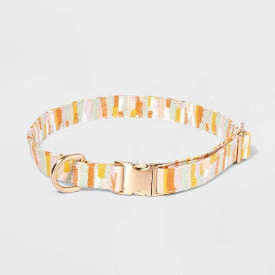 Add a pop of fun design to your pooch’s look with this Brushed Fashion Dog Collar from Boots & Barkley™. This brushed dog collar makes a fashionable dog accessory for daily walks and training sessions. It features a yellow, orange, pink and mint green brush stroke print for a fun, eye-catching look. This adjustable collar offers a customizable fit, and it comes equipped with a rose gold clip-in clasp closure and a D-ring for convenient leash and ID tag attachment.