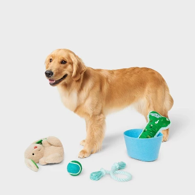 This 4-Piece Gift Basket Dog Rope Plush Toy Set from Boots & Barkley™ gives your furry best friend’s toy collection a complete refresh. This toy set includes a rope, a tennis ball, a plush bunny and a plush bone. The plushes crinkle and squeak when squeezed for extra fun, and the set also includes a blue gift basket for attractive storage of the toys.