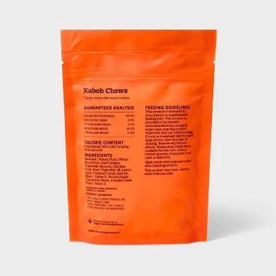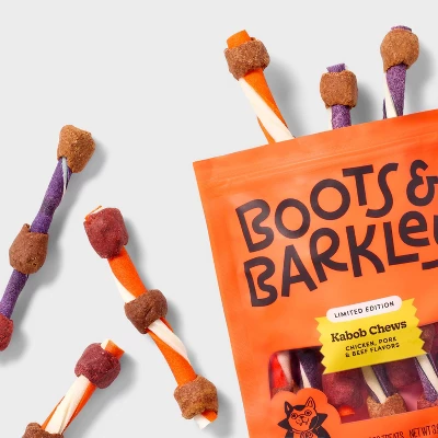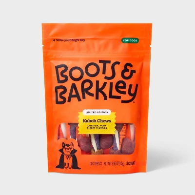 Your furry friend will enjoy the Halloween Beef Flavor Rawhide Kabob Dog Treats from Boots & Barkley™. These dog treats include kabob chews in chicken, pork and beef flavors to help create a mouth-watering treat they’ll love. Ready-to-eat, this limited edition dog treat pack is suitable for dogs of all sizes.