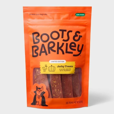 Make your pet’s day by giving them the Halloween Chicken and Pumpkin Jerky Dog Treats from Boots & Barkley™. These dog treats include jerky treats with chicken and pumpkin flavors to help create a tasty treat they’ll love, whether it’s Halloween or any other day. Ready-to-eat, this limited edition jerky dog treat pack is suitable for dogs of all sizes.